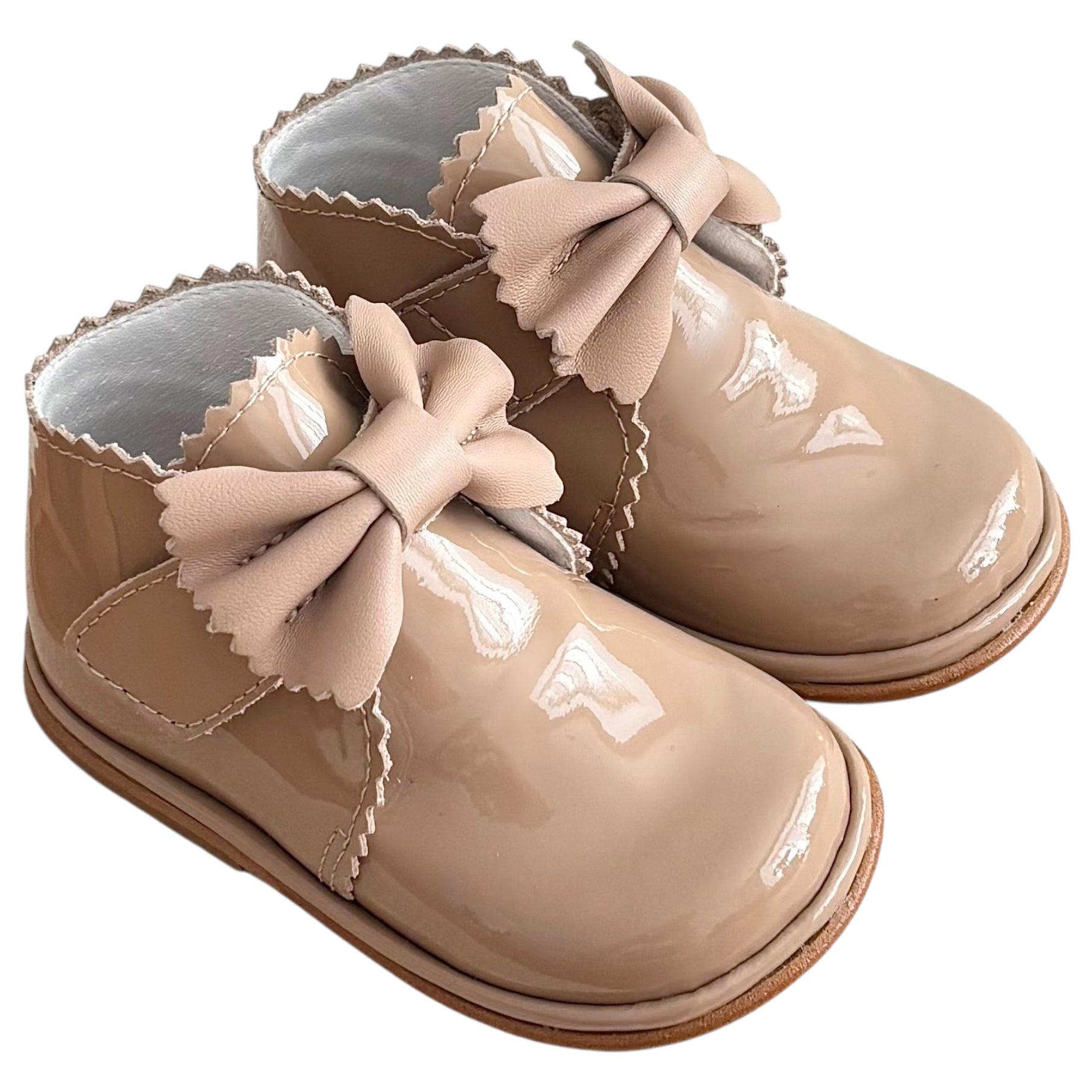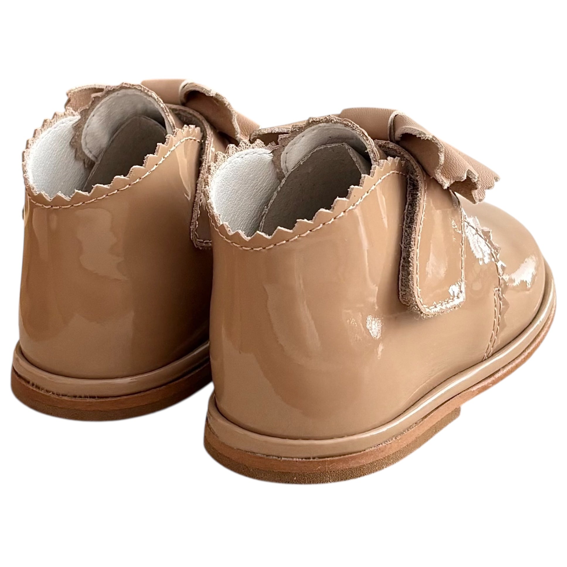 Sharon Camel Patent Leather Velcro Boot with Bow