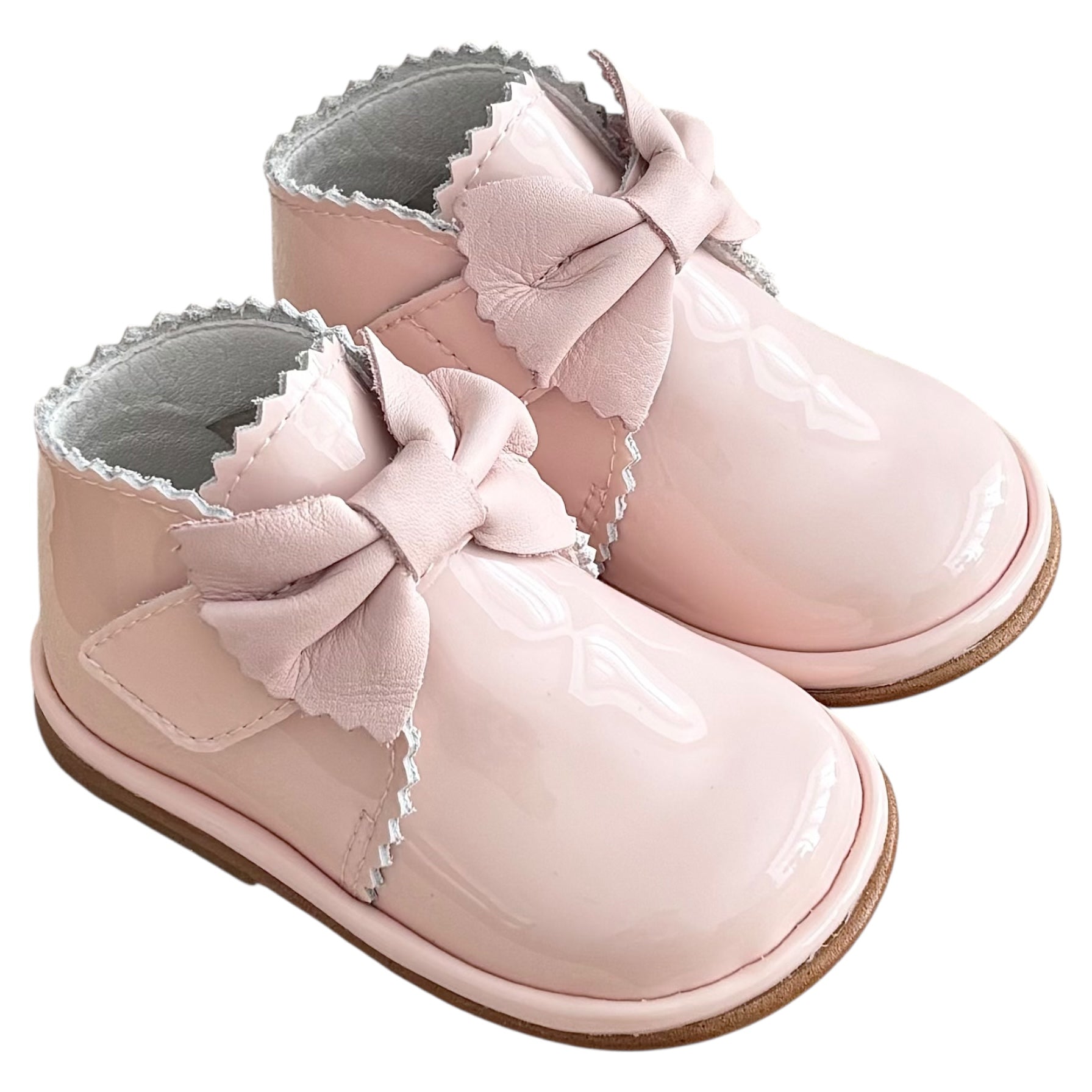 Sharon Pale Pink Patent Leather Velcro Boot with Bow
