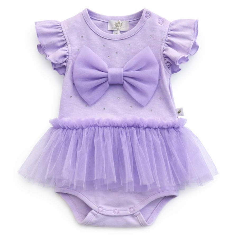 Caramelo Girls Purple Lilac Stretch Jersey Tulle Bow Romper