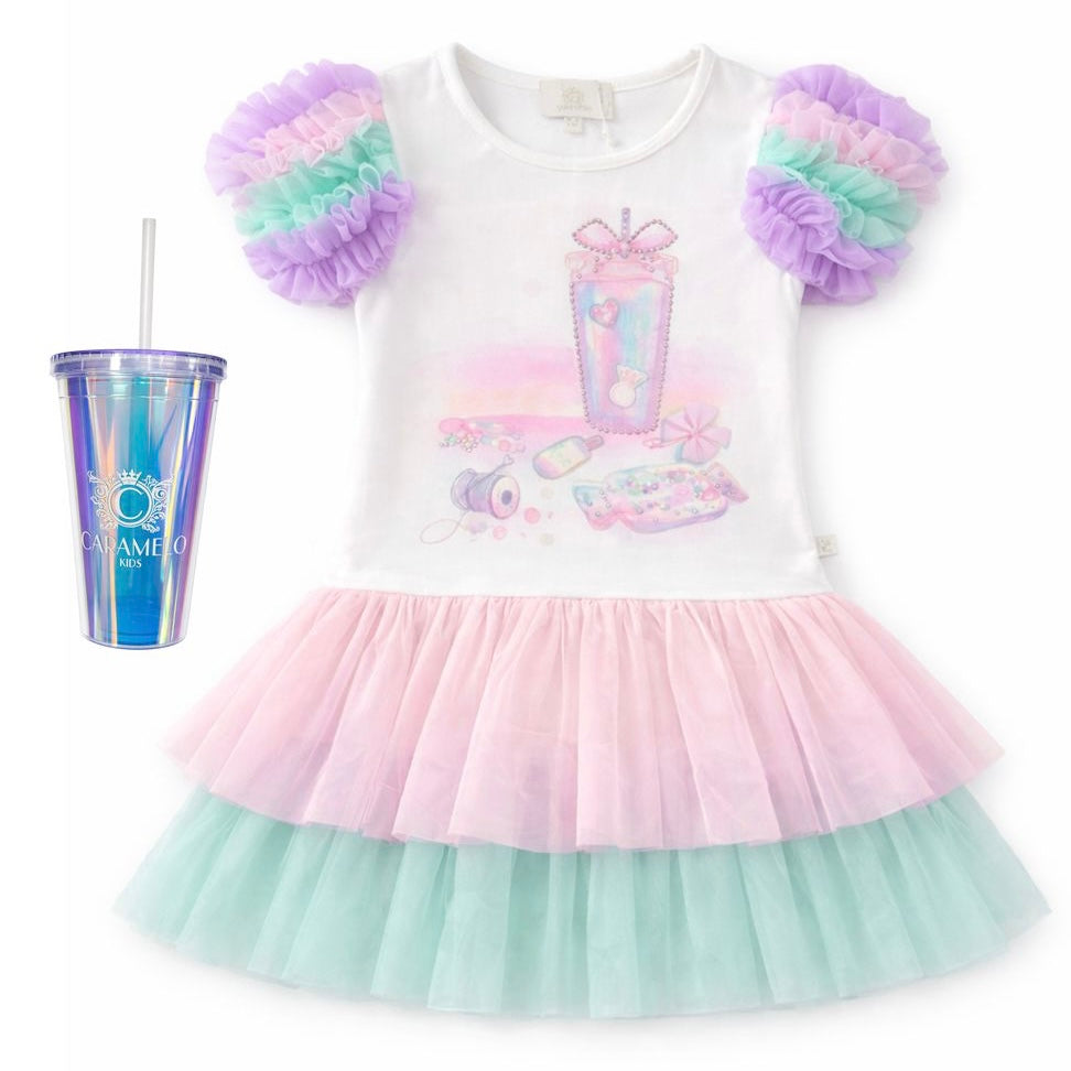 Caramelo Girls Stretch Jersey Multicoloured Tulle Dress and Tumbler