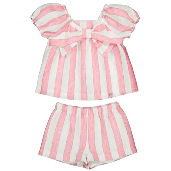 Mayoral Girls Pink Linen Striped Bow Short Set