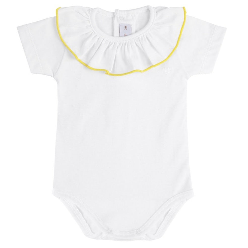 Girls White Yellow Trim Frill Bodysuit