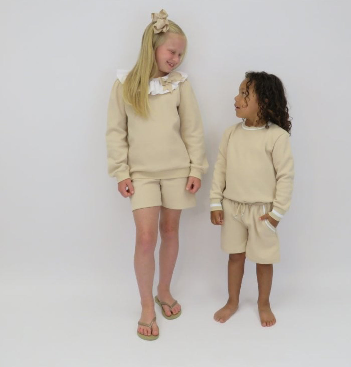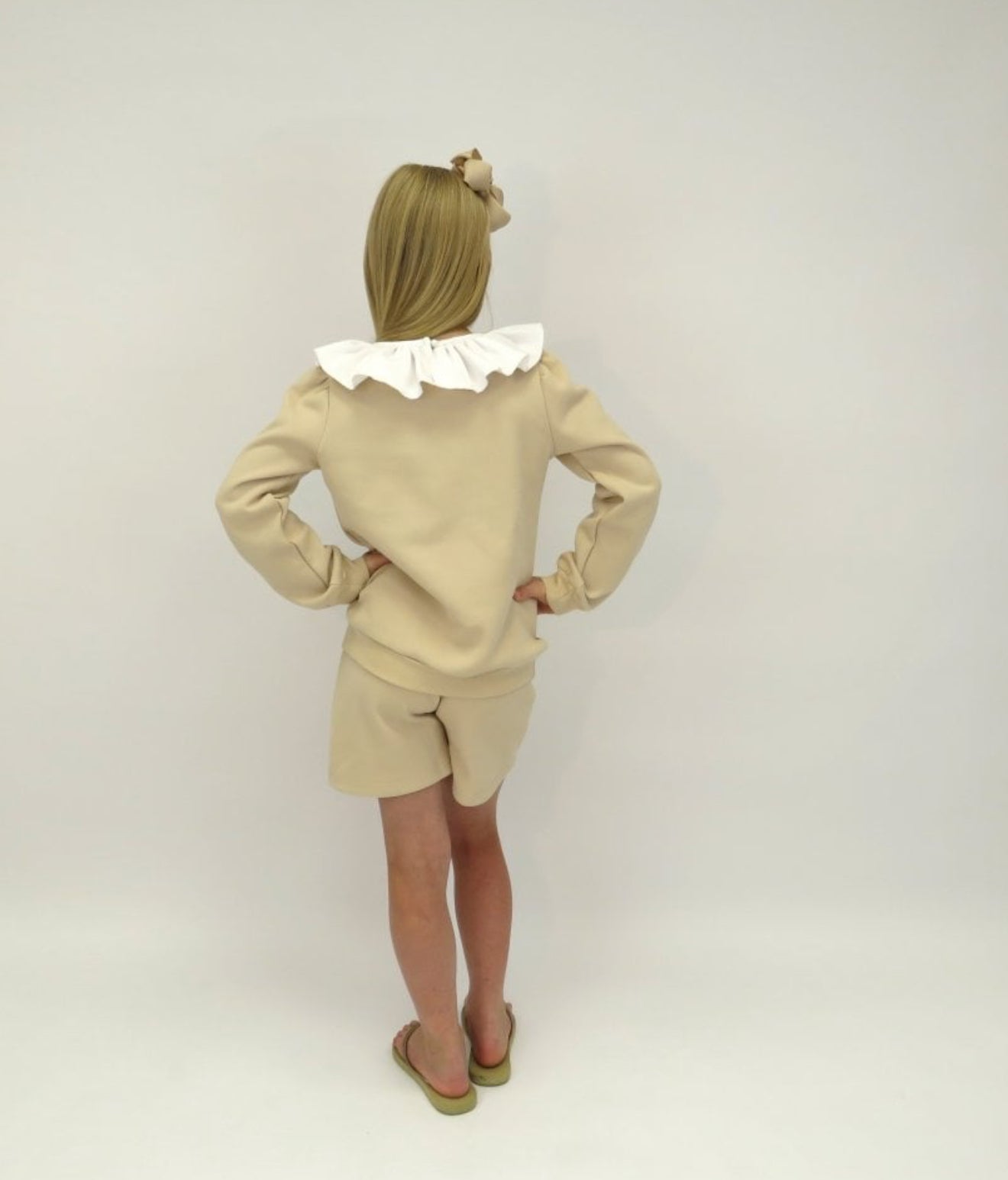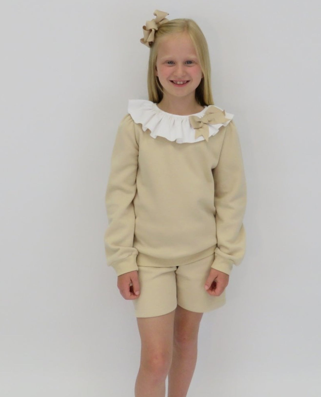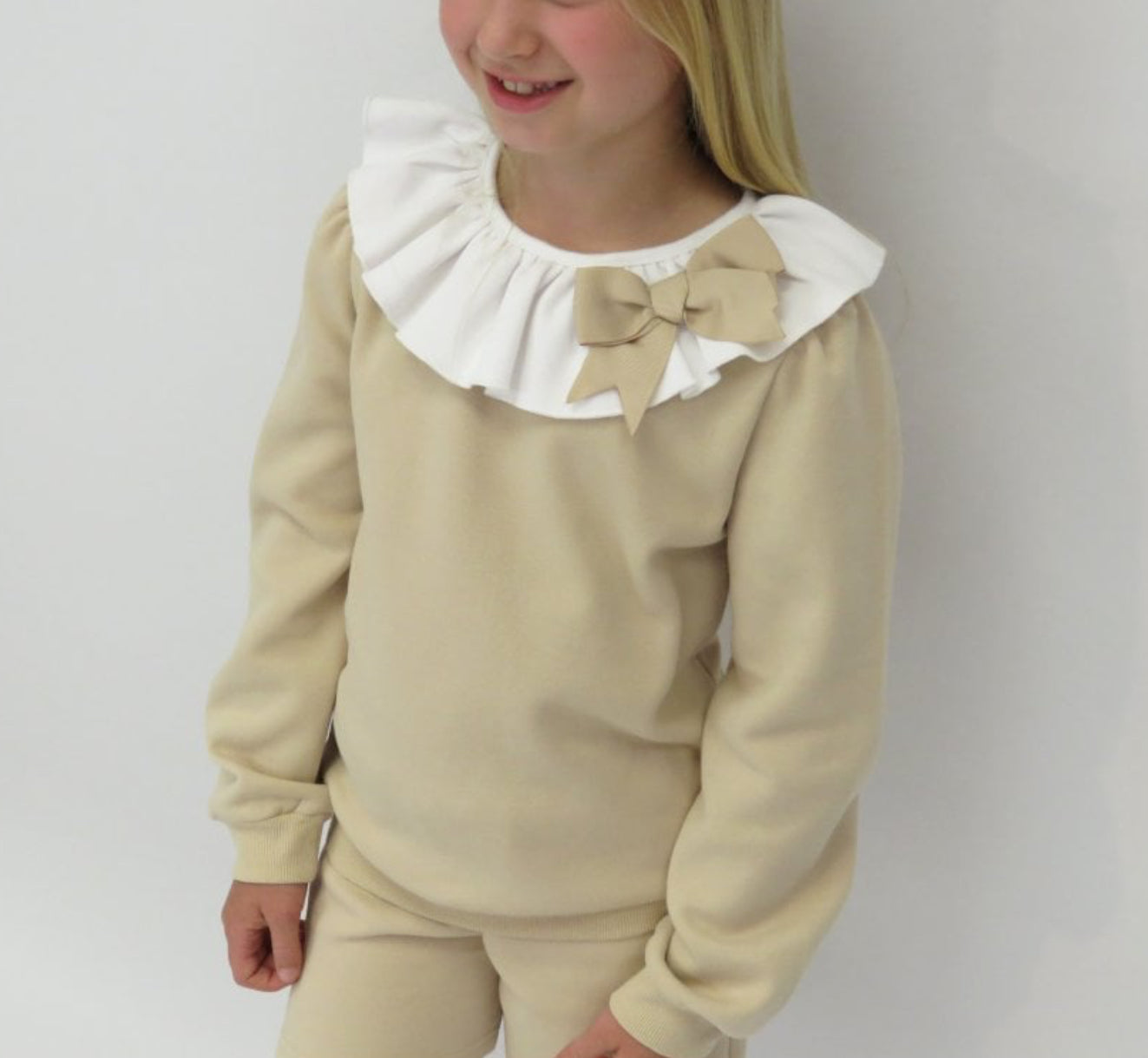 Girls Beige Frill Collar Jumper Short Set