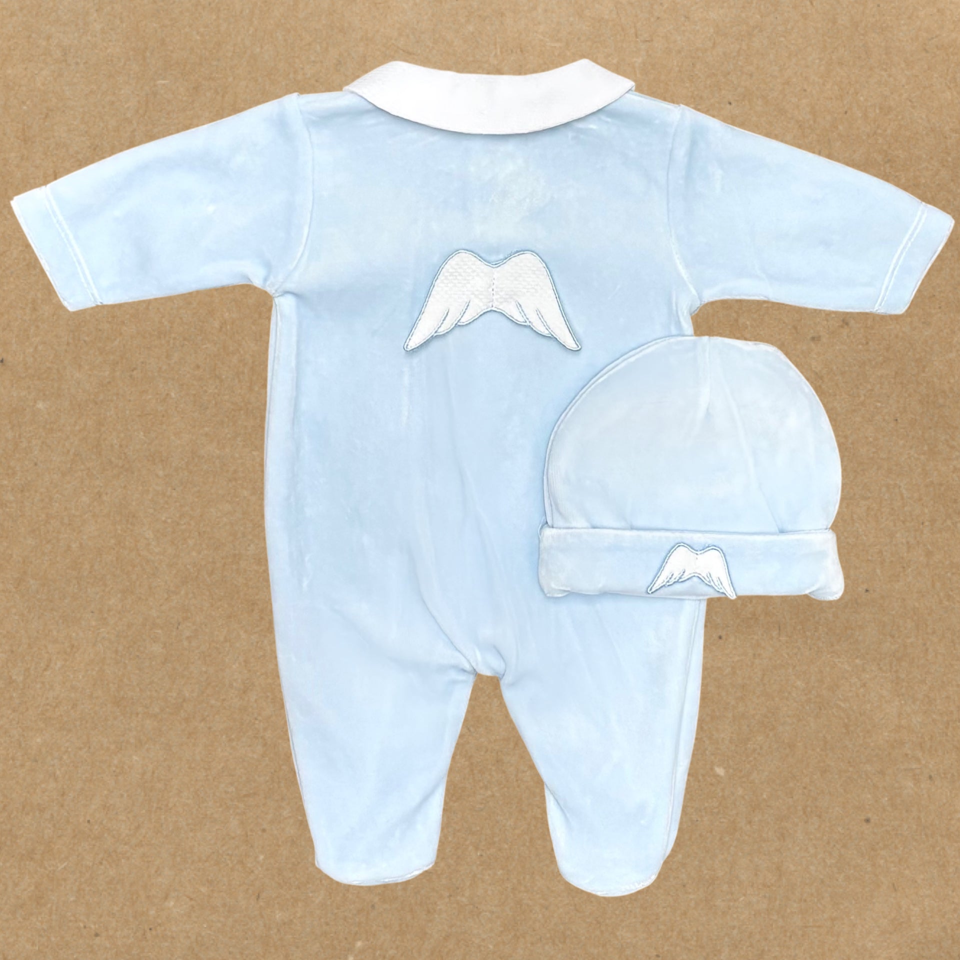 Little Star Boys Blue Velour Wing Babygrow and Hat